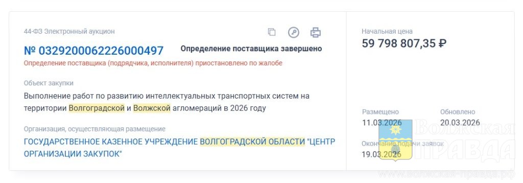 Информация о приостановке электронного аукциона на «выполнение работ по развитию интеллектуальных транспортных систем на территории Волгоградской и Волжской агломераций в 2026 году», появилась на официальном портале госзакупок.