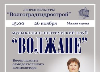 Дворец культуры «Волгоградгидрострой» приглашает на встречу музыкально — поэтического клуба «Волжане», которая состоится 26 ноября.Программа будет посвящена памяти самодеятельного композитора Анны Карловой.Руководитель объединения - Маргарита Набоко.Начало в 15:00.6+