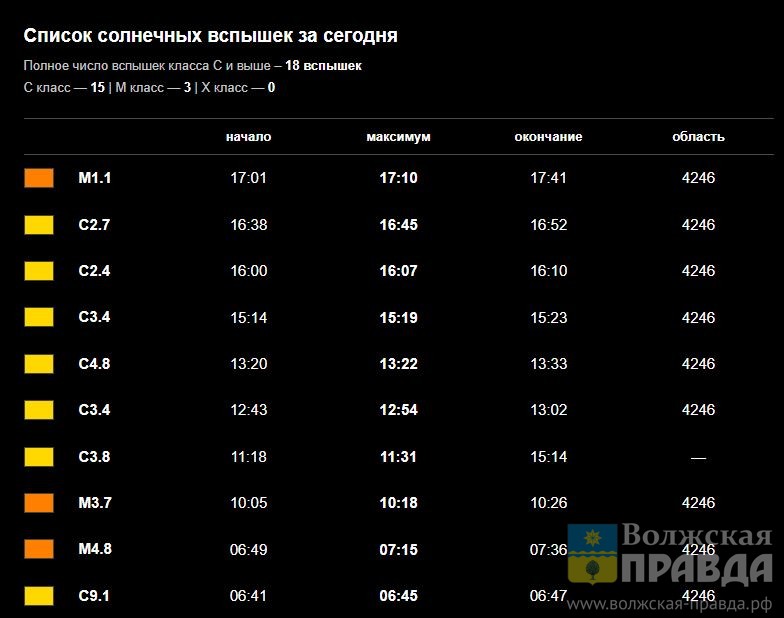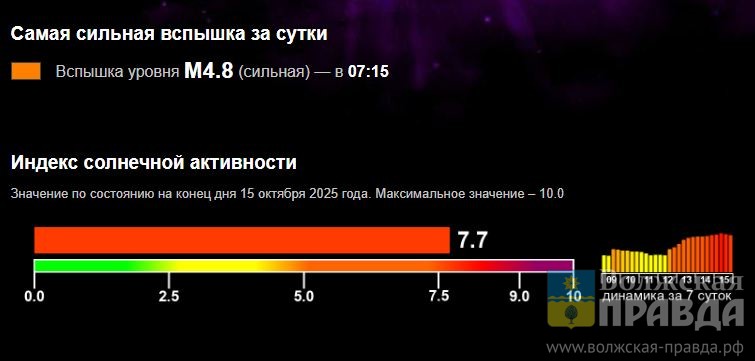 Впервые с июня индекс вспышечной активности Солнца поднялся до критического значения. Как рассказали «Волжской правде» в Лаборатории солнечной астрономии ИКИ и ИСЗФ, утром 15 октября наблюдались максимальные значения: 8.1 по 10-ти балльной шкале. Этот индекс отражает общую силу всех солнечных вспышек за последние два дня. При этом специалисты учитывают временной фактор. Недавние солнечные процессы вносят больший вклад в текущую ситуацию, чем те, что были зафиксированы полтора-два дня назад.