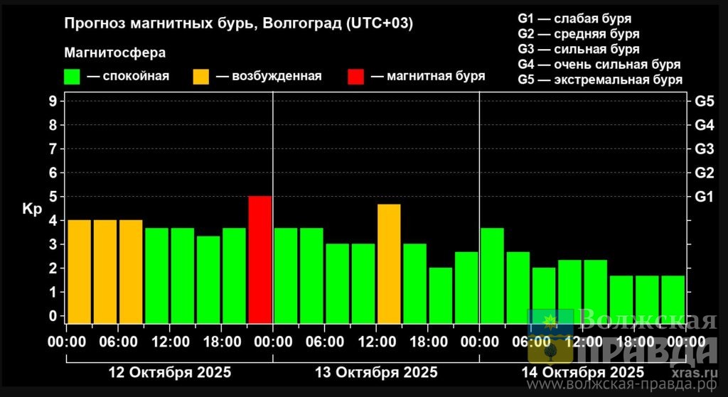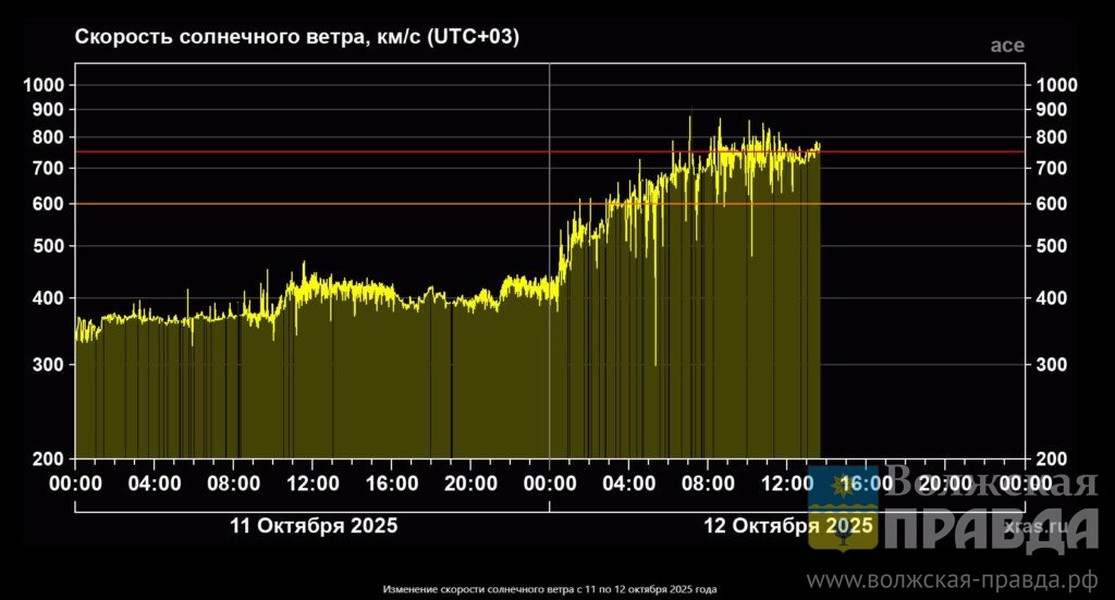 Сегодняшняя динамика также показывает увеличивающуюся скорость солнечного ветра. Это свидетельствует о том, что Земля уже погружается в поток высокоэнергетической плазмы из солнечной корональной дыры. Уже к концу суток 12 октября начнутся магнитные бури. Обозначенная на графике красной чертой граница служит ориентиром. Она разделяет обычный высокий уровень солнечного ветра от крайне высокого. Следовательно, влияние солнечного ветра ощутимо.