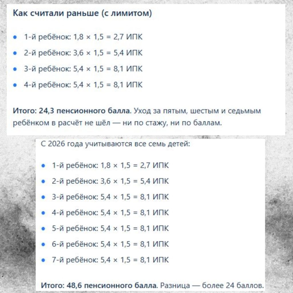 Важно, что новые правила распространяются не только на детей, родившихся после 2026 года, но и на тех, кто появился в семье раньше. При оформлении пенсии после 1 января 2026 года все периоды ухода за детьми учтут автоматически.