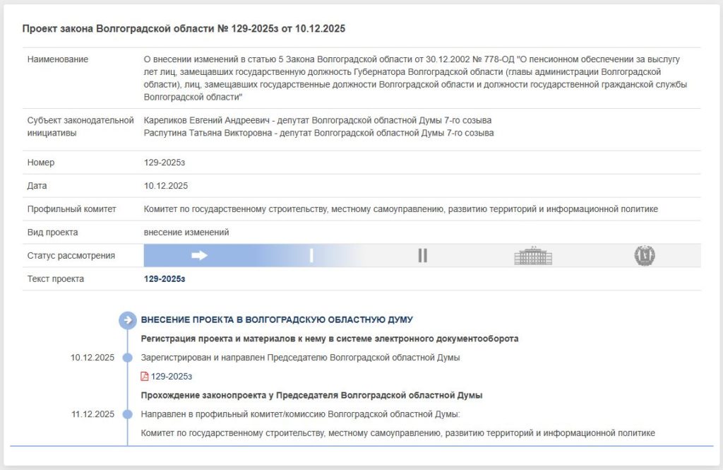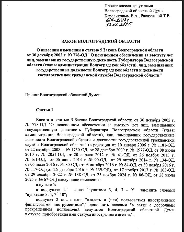 «Проектом закона предлагается внести соответствующие изменения в статью 5 Закона Волгоградской области, установив, что пенсия за выслугу лет не назначается лицам, замещавшим государственные должности Волгоградской области, полномочия которых были прекращены досрочно в случае приобретения ими статуса иностранного агента», – говорится в документе.