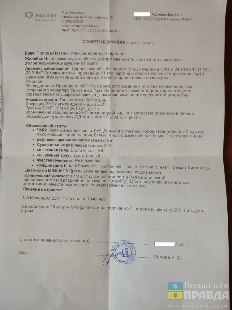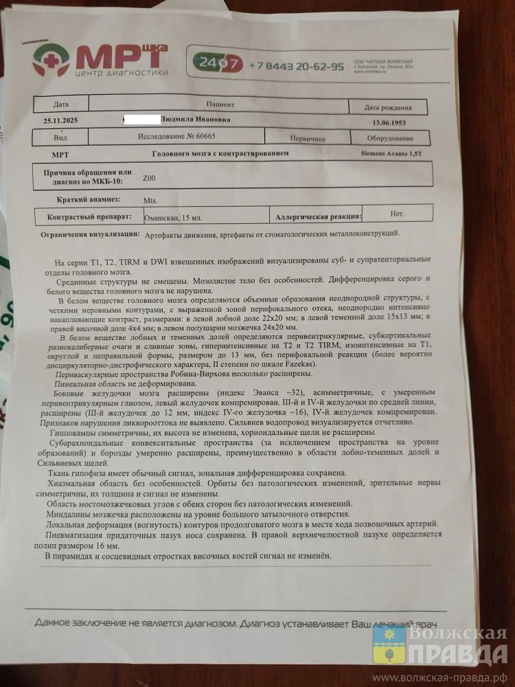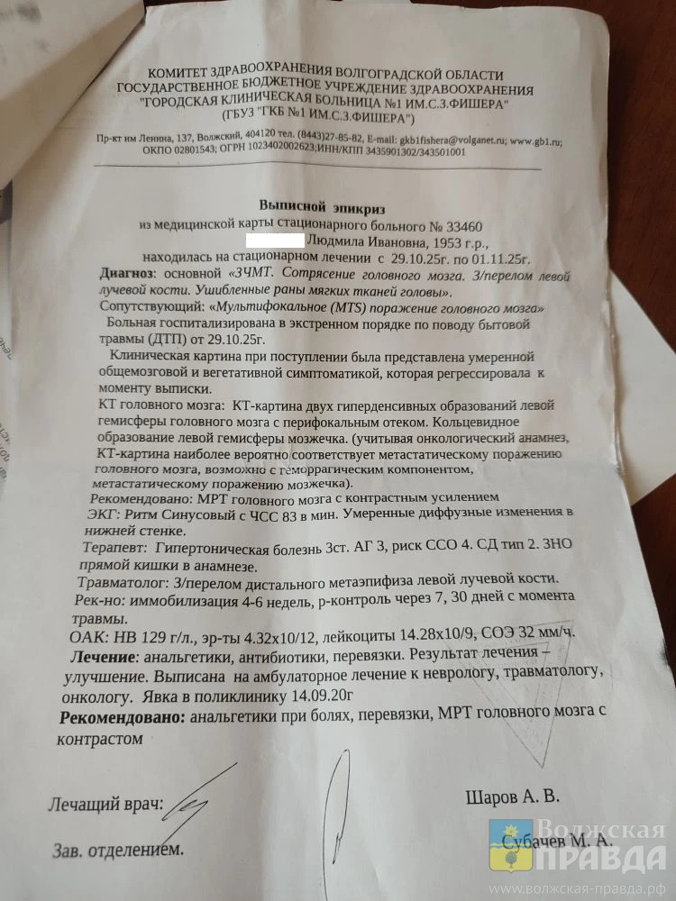Отвезли несчастную в горбольницу № 1 в 13 м/р. «Ей там сделали КТ, диагностировали сотрясение мозга и черепно-мозговую травму, — рассказывает нам Елена. — Потом наложили несколько швов на бровь, один на нос, загипсовали руку. К слову, следы от швов остались и никуда не денутся. От сотрясения и ЧМТ ей не делали ничего. Выписали маму из больницы уже 1 декабря. Просто домой. И с момента выписки к тому моменту, когда я к ней переехала, её состояние ухудшилось неимоверно. И, чтобы не терять время, мы обратились в платную клинику. Сделали МРТ почти на восемь тысяч рублей, сходили к неврологу, который выписал уколы и таблетки еще на три тысячи рублей, но сказал, что то, что происходит с мамой, — не по его части. Видимо, ушиб головы вызвал отёк мозга и запустил в нём какие-то процессы…».