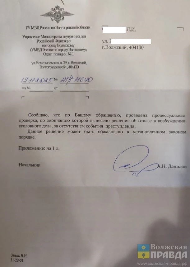 В общем, в возбуждении уголовного дела Людмиле Ивановне отказали «в связи с отсутствием события преступления» (№ 41/1-11640 от 07.11.2025 г., подписано А. Д. Даниловым).