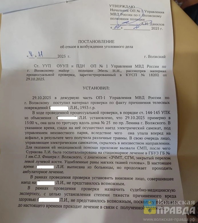 Постановление об отказе в возбуждении уголовного дела от 7.11 2025 года гласит, что «в рамках проведённой проверки установить виновное лицо, совершившее наезд, не представляется возможным».