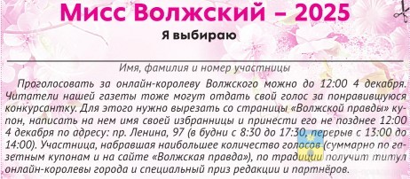 Участница, набравшая наибольшее количество голосов (суммарно по газетным купонам и на сайте «Волжская правда), по традиции получит титул онлайн-королевы города и специальный приз от редакции «Волжская правда».