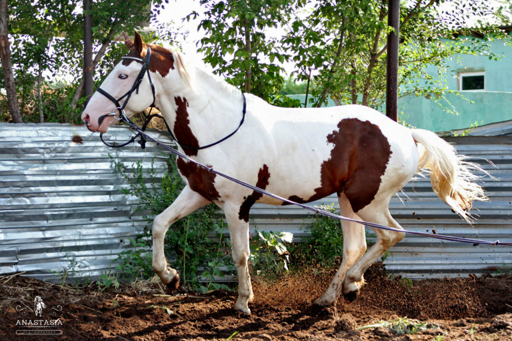 Особо Семёну приглянулся жеребец-полукровка Ганеш. Это был красивый белый спортивный конь с большими рыжими пятнами. Он родился в 2014 году у Нарзана и Германии. А на момент истории коню уже было лет пять.