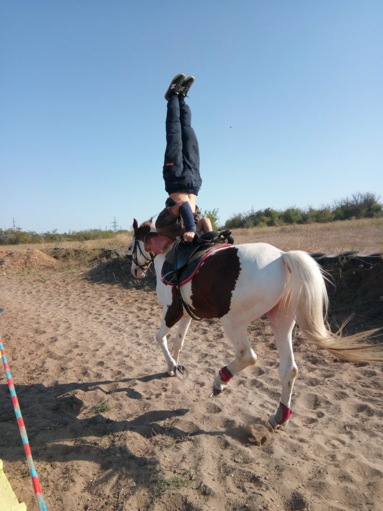 Сначала Хатанга перепрыгивала через препятствия панически, без всадника и седла. Потом то же самое повторяли с всадником. Трусишку подбадривали вкусняшками, чтобы вырабатывалось у неё понимание, что ей нравится проходить препятствия. Со временем «коридор» убрали, лошадь самостоятельно выполняла прыжки. Так страхи Хатанги постепенно отступали и сменились на удовольствие.