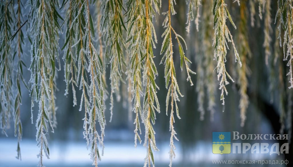 — Ива покрыта тонким слоем инея — зима ожидается затяжной.