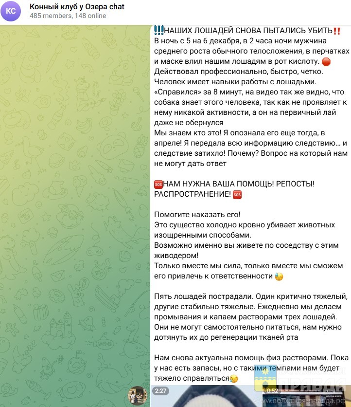 — В нашей конюшне в 2 часа ночи 6 декабря снова произошло покушение на лошадей, — рассказывает девушка на опубликованном в чате видео. – Еще более изощренное, чем было в апреле. Нашим лошадям в рот залили кислоту… Точно пока не знаем какую: серную или азотистую. Нападавший не постеснялся камер. И, хотя он был в маске и перчатках, мы уверены, что это был тот же самый человек, который убил наших лошадей в ночь с 12 на 13 апреля.