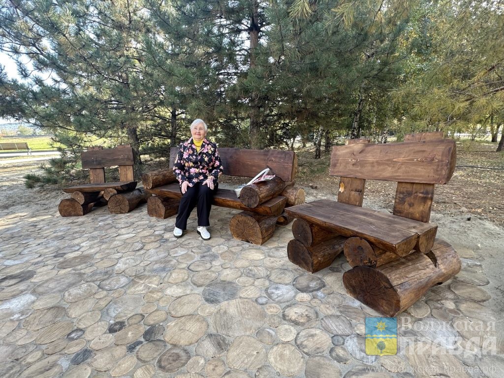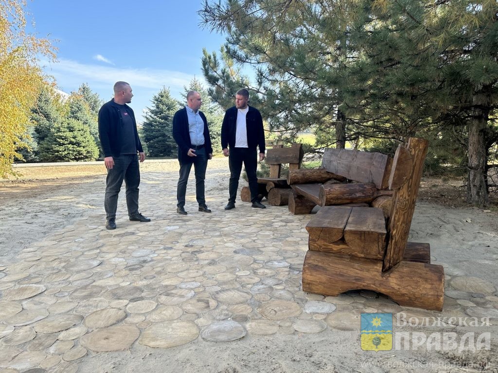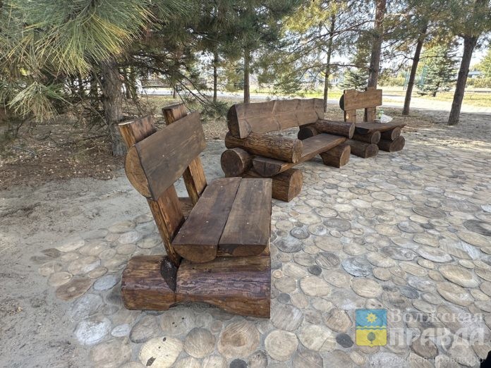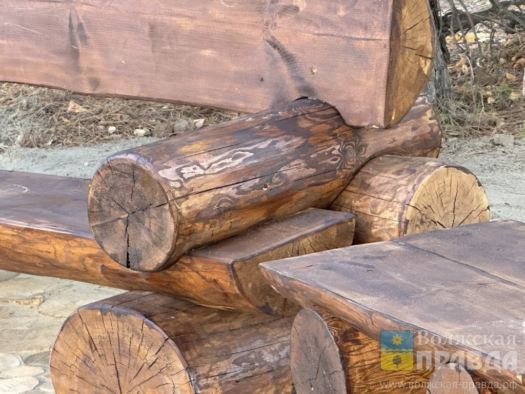 В Волжском недалеко от памятника воинам-интернационалистам появился новый благоустроенный уголок. Там расположились словно перенесенные из древнерусской сказки два кресла и диван из тёсаных брёвен, а площадка под ними и тропинка выполнена из спила деревьев.