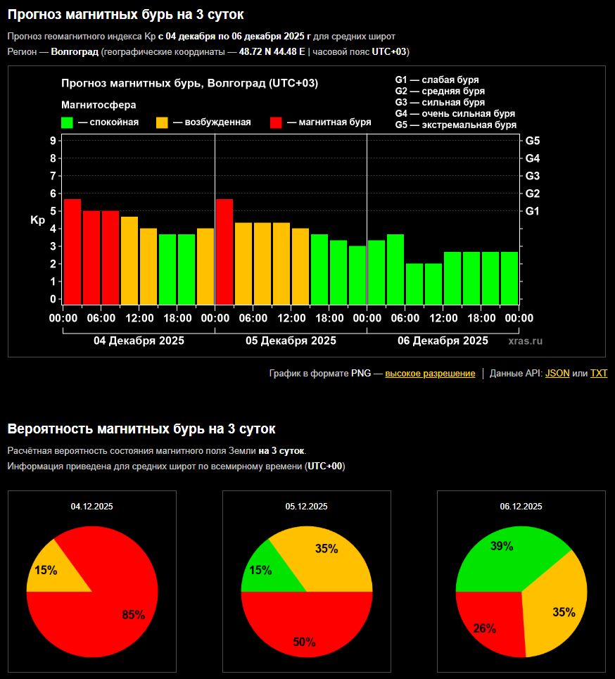 Как стало известно «Волжской правде», по прогнозам в пятницу 5 декабря нашу планету всё ещё будет «штормить». Основной пик возмущений придётся на ночное время: с полуночи до 3 часов ночи. В эти часы возможна магнитная буря уровня G1.7, сообщили в Лаборатории солнечной астрономии ИКИ и ИСЗФ. Затем геомагнитный индекс начнёт понижаться и после 15:00 войдёт в спокойную «зелёную» зону.