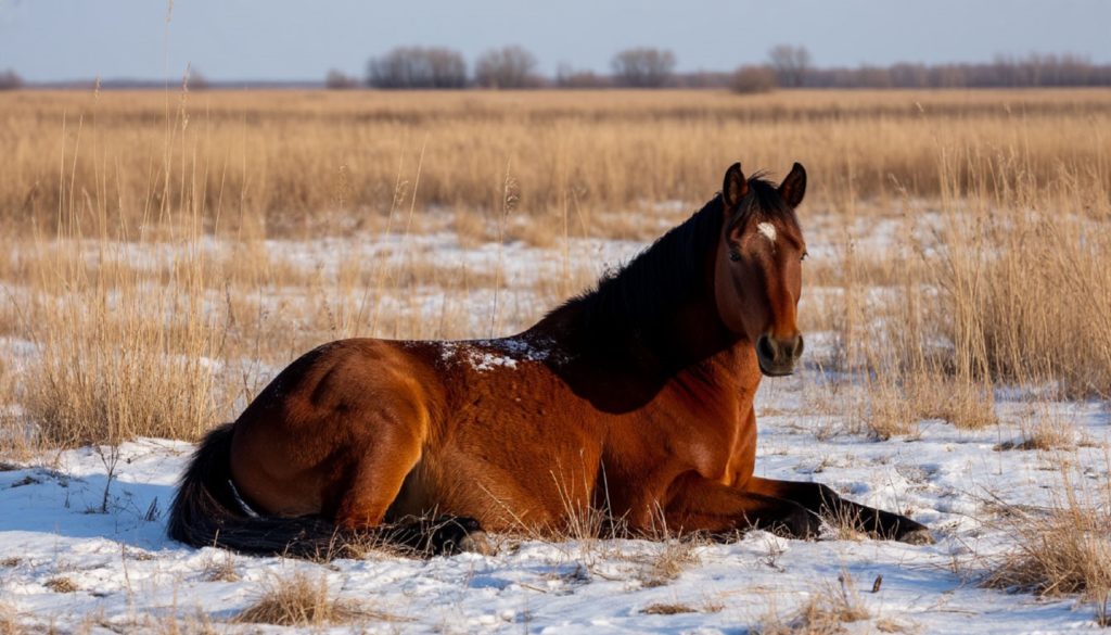 — Конь прилёг на заснеженную гладь — впереди тёплые дни.