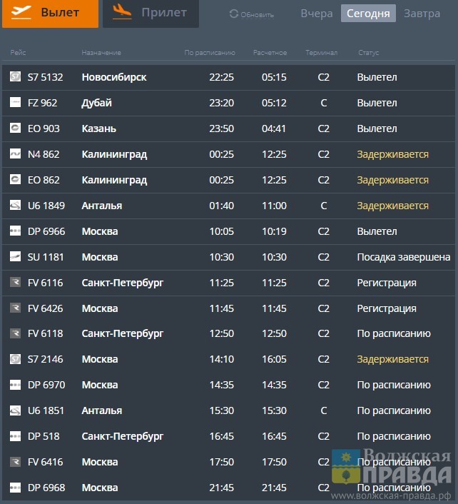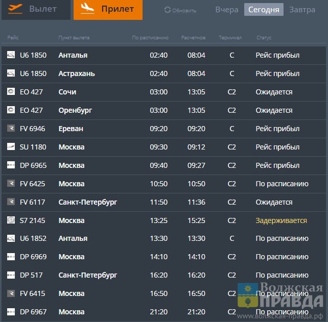На текущий момент, как сообщает информ-ресурс airportvolgograd.ru, задерживаются 4 вылета: 2 в Калининград, 1 — в Анталью и 1 — в Москву. Из прилетающих пока в задержке только один самолёт — из столицы.