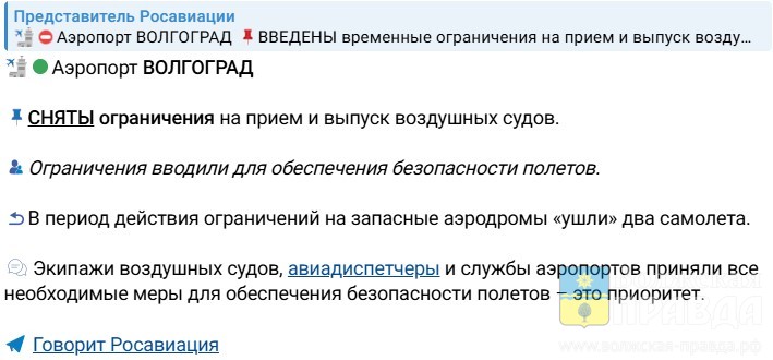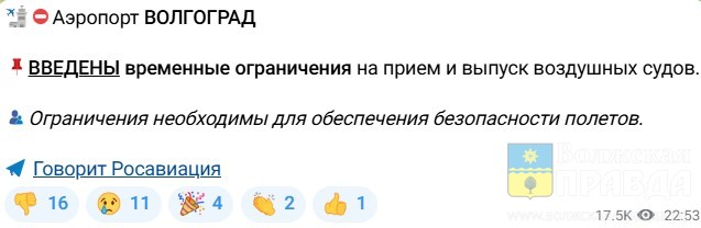 Росавиация ввела ограничения на приём и выпуск самолётов в 22:53, сняла – в 04:11. Об этом проинформировал в своём официальном ТГК пресс-секретарь ФАВТ Артём Кореняко.