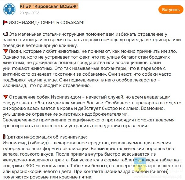Стоит отметить, что КГБУ «Кировская станция борьбы с болезнями животных» еще в 2023 году распространила на своих ресурсах предупредительные посты об использовании догхантерами изониазида.