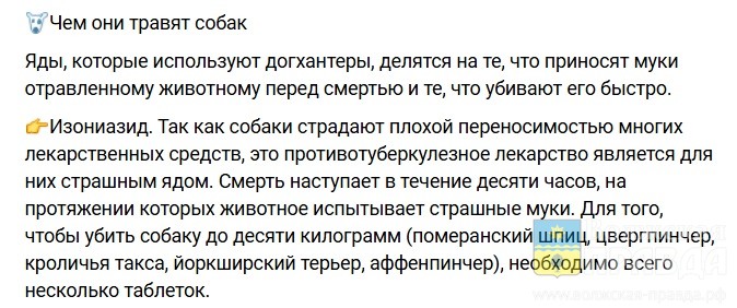 «Яды, которые используют догхантеры, делятся на те, что приносят муки отравленному животному перед смертью и те, что убивают его быстро, — констатирует Пенза. — Так как собаки страдают плохой переносимостью многих лекарственных средств, противотуберкулезное лекарство Изониазид является для них страшным ядом. Смерть наступает в течение десяти часов, на протяжении которых животное испытывает страшные муки. Для того, чтобы убить собаку до десяти килограмм (померанский шпиц, цвергпинчер, кроличья такса, йоркширский терьер, аффенпинчер), необходимо всего несколько таблеток».