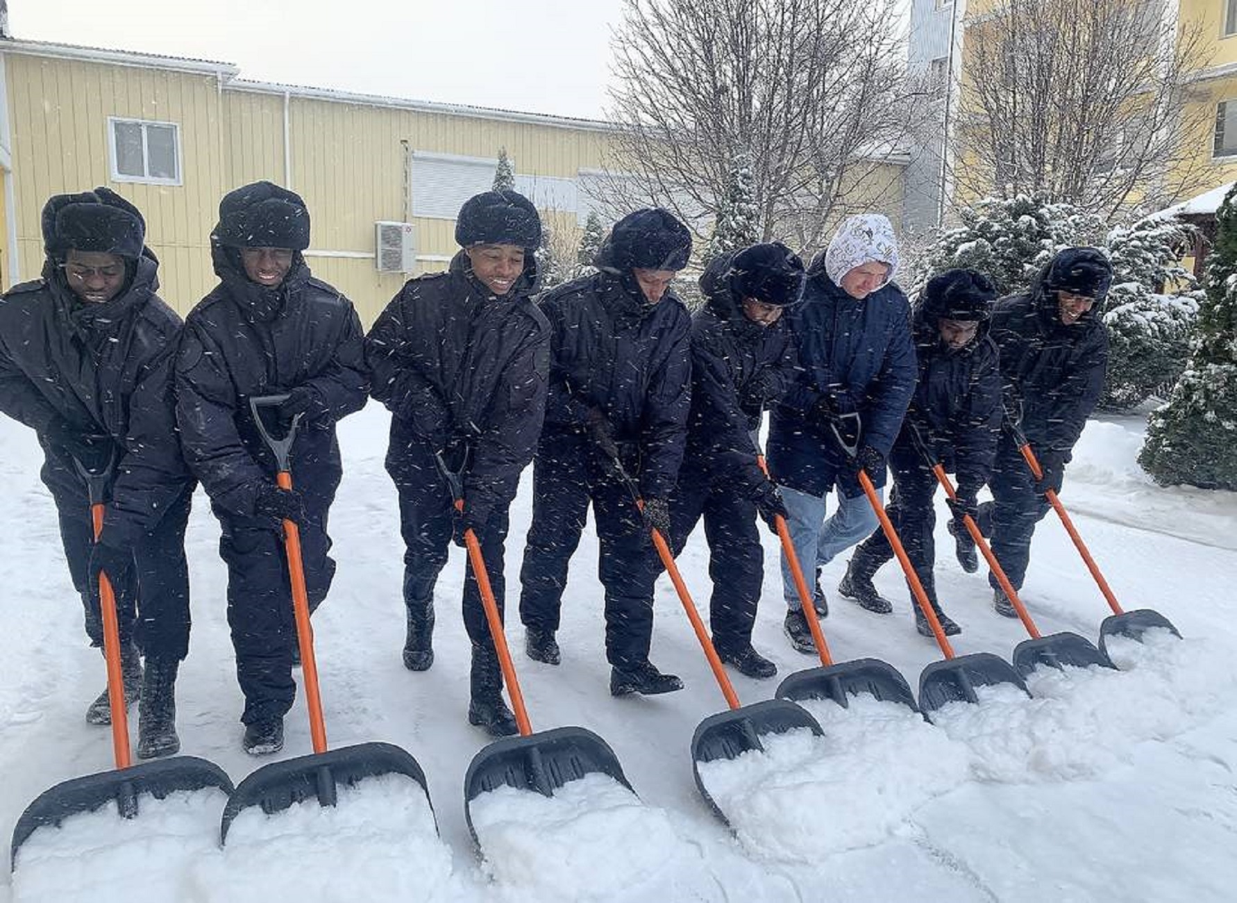 Но простым созерцанием падающих снежных хлопьев иностранные слушатели не ограничились. Руандийские гости смогли поучаствовать в настоящей зимней забаве – копании снега. Прогулка превратилась в «трудовой подвиг». Будущие полицейские взяли в руки лопаты, чтобы расчистить двор у общежития.