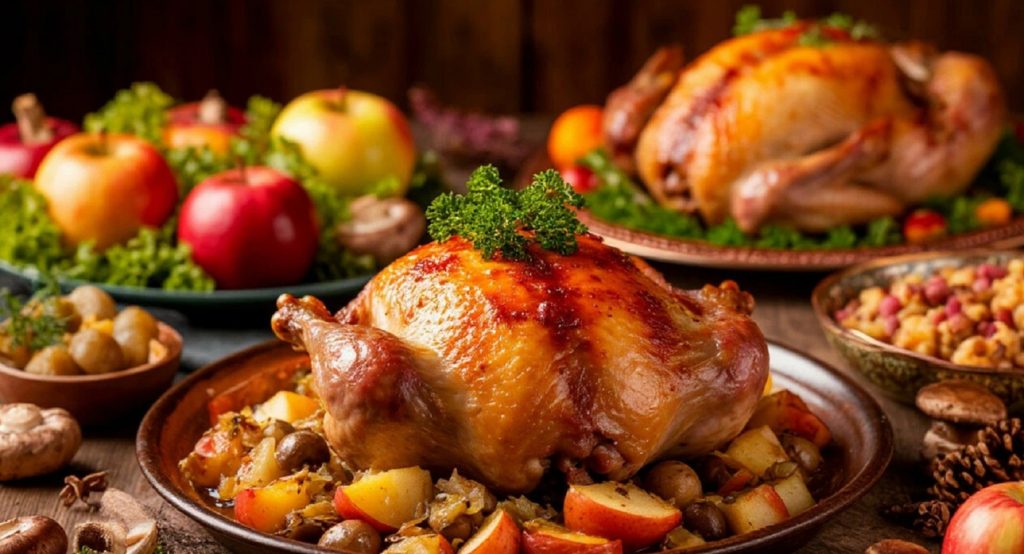 В домах в этот день готовили особые блюда из дичи. Деликатесное мясо щедро фаршировали доступной начинкой – яблоками, капустой, грибами или другими дарами природы. Такое блюдо занимало почётное место в центре стола, окружённое калейдоскопом других угощений. По обычаю давних времён, чем больше кушаний, тем сытнее и богаче будет жизнь. Чтобы разделить радость предстоящего изобилия, на застолье непременно звали гостей.