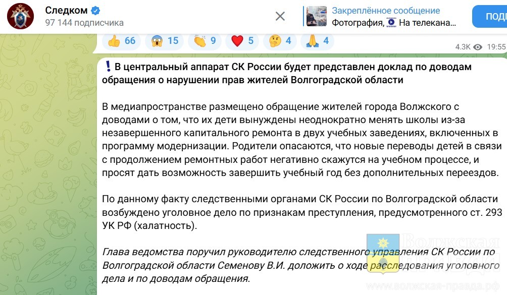 СК России запросил доклад по обращению родителей учеников 13-й школы, размещённого в социальных сетях, мессенджерах и на официальных порталах СМИ.