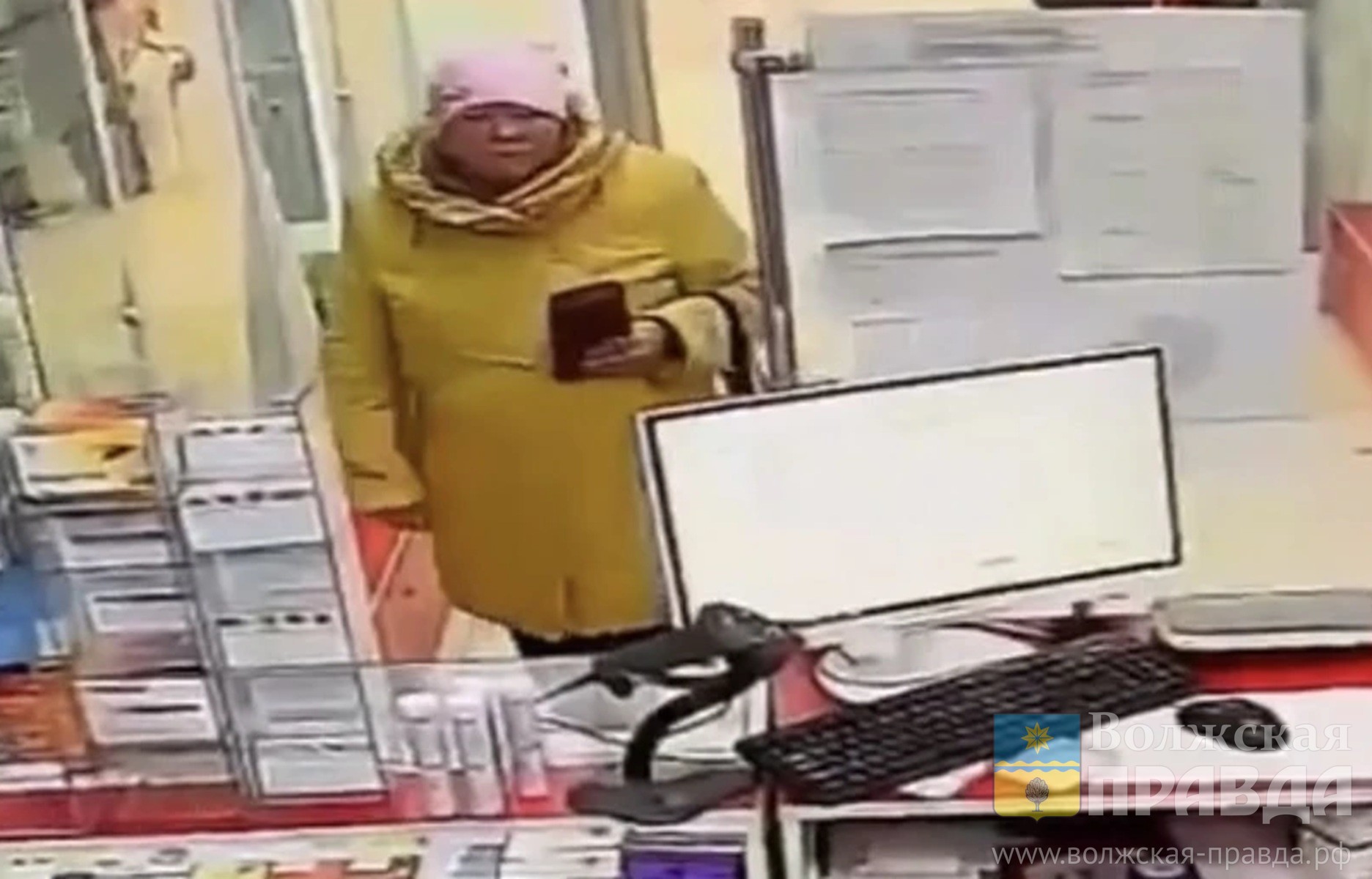 В момент транзакций женщина была одета в жёлтую куртку, тёмные штаны, розовую шапку и ботинки тёмного цвета.