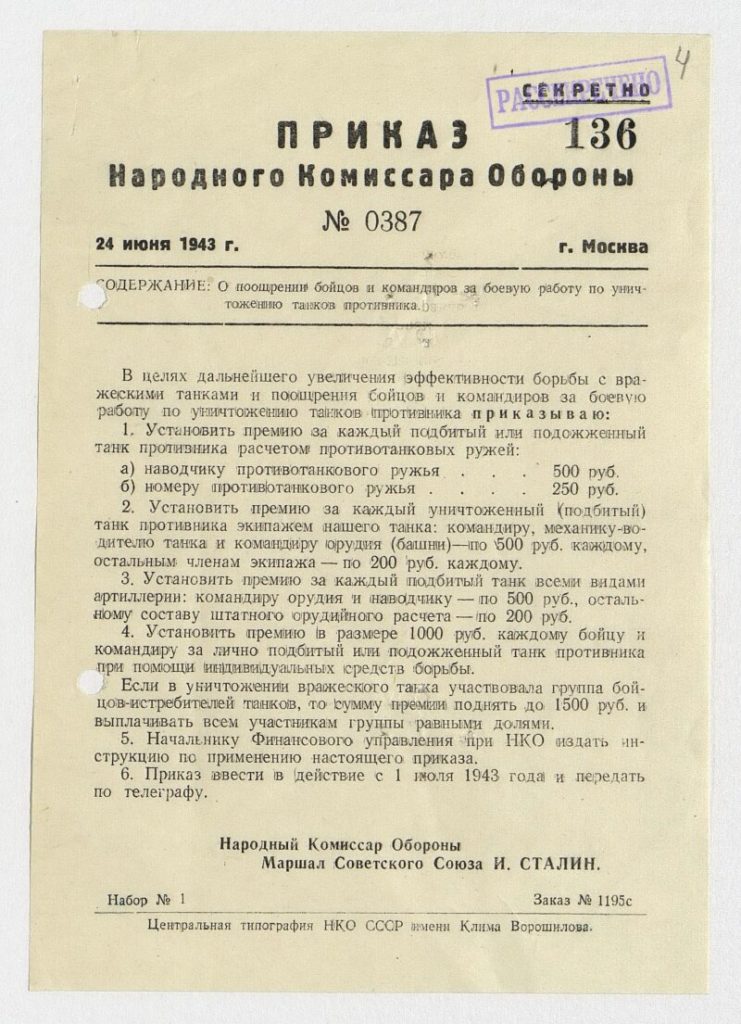 В июле 1942 года была установлена премия за каждый подбитый танк. Командиру орудия и наводчику — по 500 рублей, остальному составу орудийного расчета — по 200. Экипажу танка за уничтоженный немецкий «Тигр» платили по 500 рублей, пехотинцам — 1000 рублей.