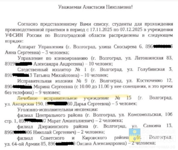 «Студенты ВКУиНТ проходят производственную практику в подведомственных учреждениях УФСИН России по Волгоградской области в соответствии с ранее заключенным договором о подготовке специалистов среднего профессионального образования, — разъяснила нам старший инспектор пресс-службы регионального главка ФСИН лейтенант внутренней службы Диана Нурумбетова. — Обращаем внимание, что учащиеся проходят практику непосредственно в административных зданиях, находящихся за пределами территорий, где расположены жилые и лечебные корпуса, куда их доступ исключён. Факторы риска для здоровья студентов отсутствуют. Распределение учащихся осуществляется в подразделения, расположенные в районах их проживания. Вместе с тем, УФСИН России по Волгоградской области по согласованию с учебным заведением и пожеланием студентов готов предоставить возможность прохождения производственной практики в других учреждениях УИС, поскольку заинтересовано в специалистах этой направленности».