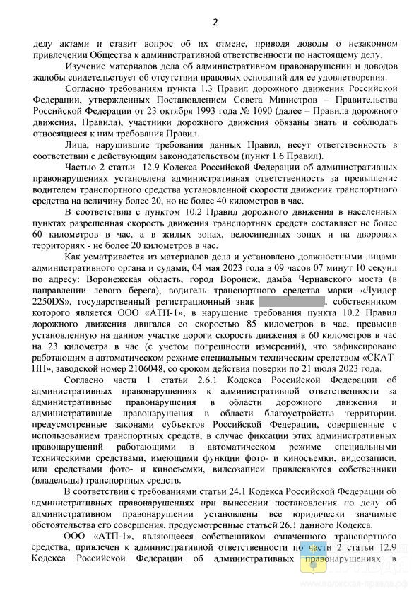 Решение о наложении двух штрафов попыталось оспорить в высшей инстанции ООО «АТП-1» из города Воронеж. Сотрудник автотранспортного предприятия двигался со скоростью 85 километров в час там, где ограничение составляло 60 км/ч. Камеры фиксации нарушений, расположенные одна за другой, зарегистрировали два последовательных превышения скорости. Они произошли на дистанции нескольких сот метров друг от друга с временным интервалом около 20-ти секунд. Данные попали в базу ГИБДД, суд вынес решение о взыскании штрафа 500 рублей с транспортной организации.