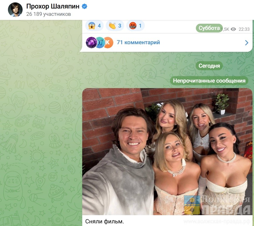 Волгоградский шоумен Прохор Шаляпин заявил в своём телеграмм канале, что завершил съёмки в фильме, название которого решил не указывать. Зато разместил на своих ресурсах фото, где он стоит в каком-то непонятном сером одеянии в обнимку с четырьмя улыбающимися девушками, две из которых одеты, мягко сказать, не по погоде, обнажив наиболее выдающиеся части своего тела.
