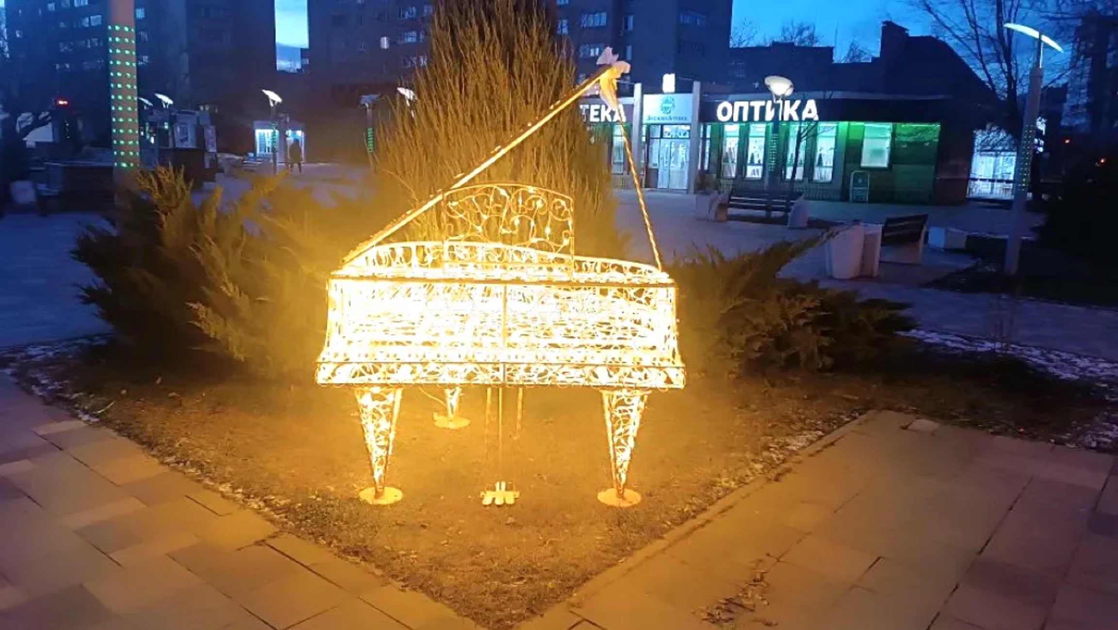 Ажурные светящиеся скульптуры расположились вблизи новогодней ели, установленной ещё на прошлой неделе. А понедельник, 15 декабря, ёлочка засверкала красочными огоньками. Теперь компанию ей составили весёлые иллюминационные музыкальные фигуры.