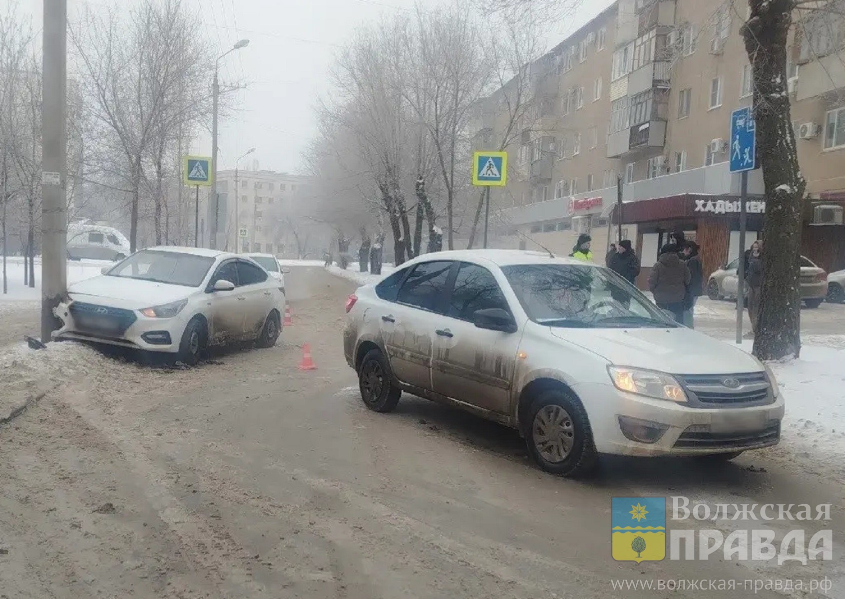 На опубликованной правоохранителями фотографии с последствиями ДТП хорошо видно то, о чём госавтоинспекторы не упомянули. После удара с отечественной легковой корейский субкомпакт срекошетил в световую опору, добавив себе разрушений.