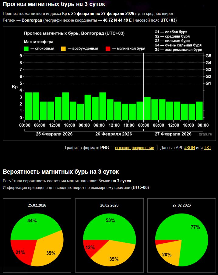 По предварительным прогнозам, вероятность магнитных бурь на 26 и 27 февраля оценивается как низкая.