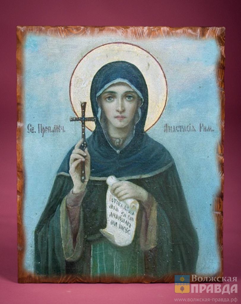 Святая появилась на свет в третьем столетии нашей эры. Оставшись сиротой в три года, девочка была принята в женский монастырь близ Рима. Впоследствии там же она приняла и монашеские обеты. Когда в государстве начались преследования христиан, Анастасию насильственно вывезли из монастыря и доставили к градоначальнику города. Ей предъявили обвинения в пренебрежительном отношении к римским аристократам и приверженности учению Иисуса Христа. Святая претерпела жестокие пытки и погибла мученической смертью.