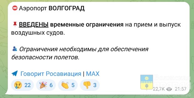 Ограничения на приём и выпуск воздцшных судов волгоградский аэропорт ввёл в 21:57, сообщил на своих ресурсах рресс-секретарь агентства – советник руководителя ФАВТ Артём Кореняко. О снятии оповестили в 6:14.