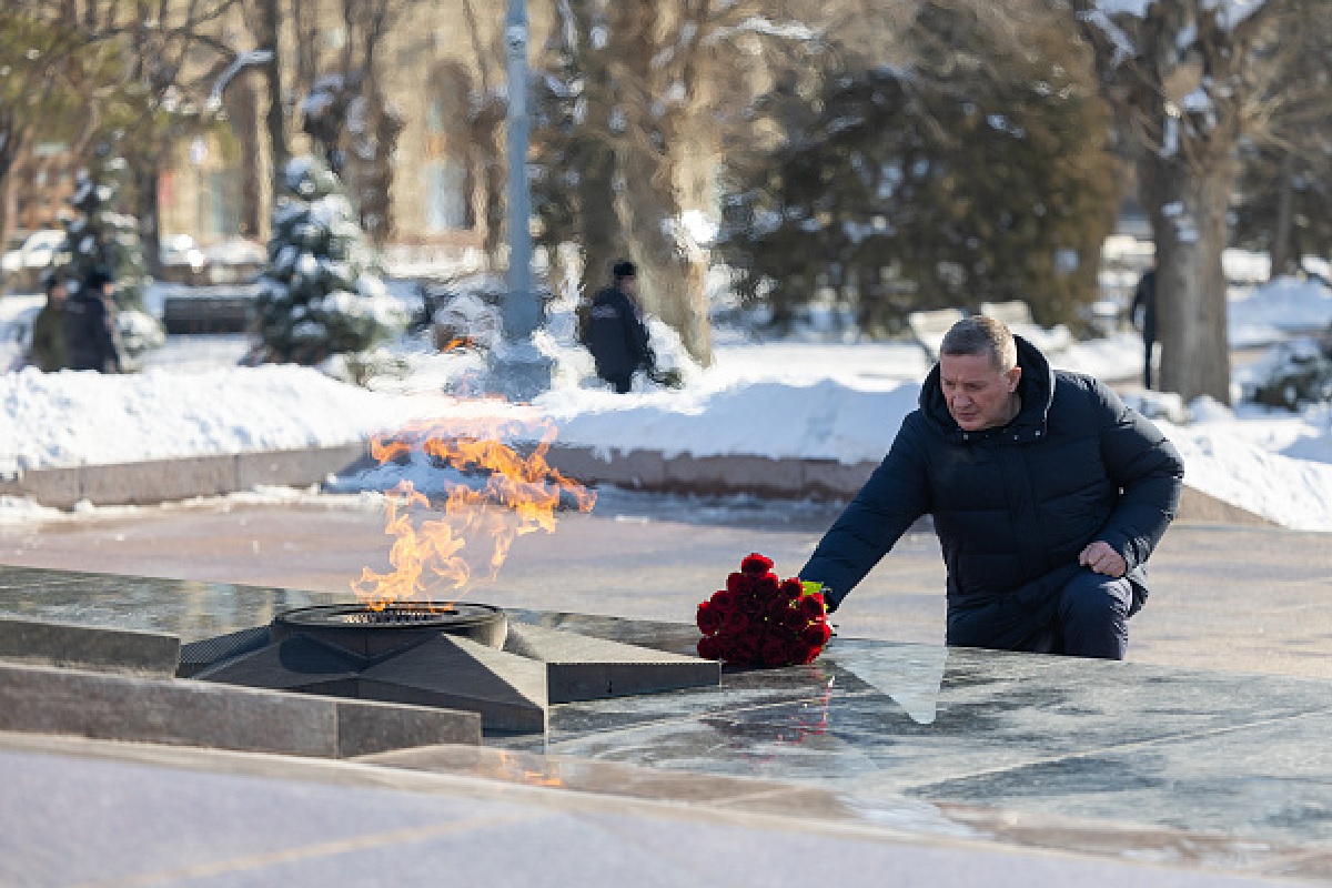23 февраля губернатор Волгоградской области Андрей Бочаров возложил цветы к Вечному огню на Аллее Героев, отдав дань памяти и уважения защитникам Родины, воинам всех поколений.