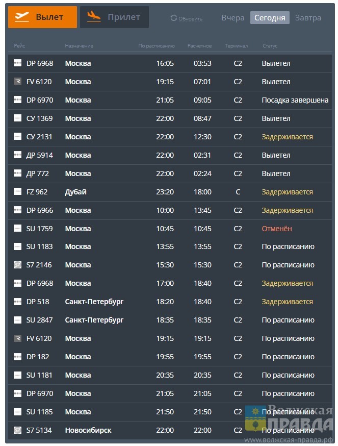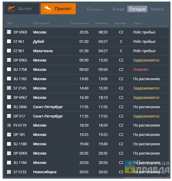 Ситуация с прилётами – не лучше: один рейс отменен (из Москвы) и 4 задерживаются: 3 столичных и один – питерский.