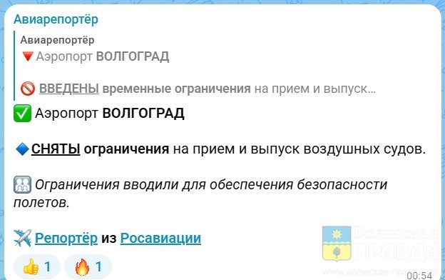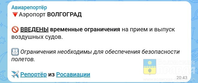 По сообщению советника руководителя Росавиации, пресс-секретаря ФАВТ Артём Кореняко, в воздушной гавани Волгограда ограничения на приём и выпуск самолётов были введены в 20:43, а сняты – в 00:54.