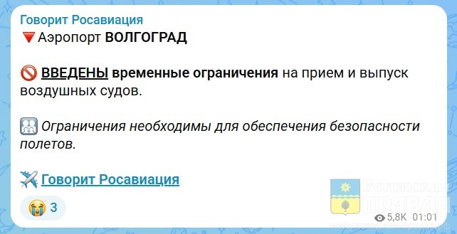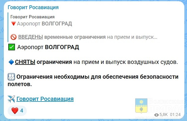 Ограничения на приём и выпуск самолётов в волгоградской аэропорту вводились с 01:01 до 01:24. Об этом сообщает канал Макс «Говорит Росавиация».