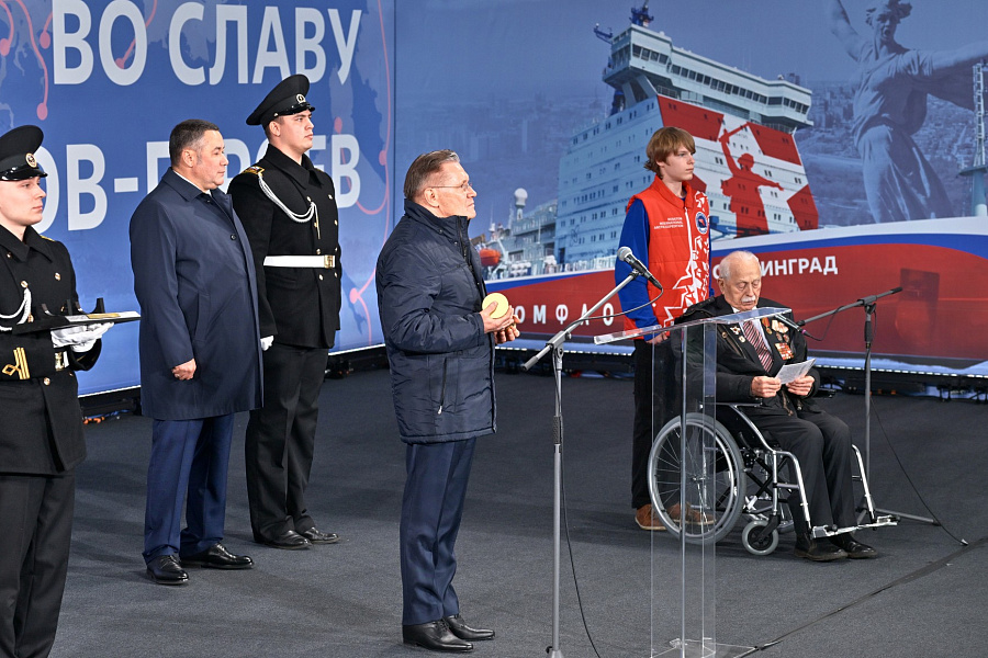 Символичным стало вручение капсулы с землёй Мамаева кургана генеральному директору «Росатома» Алексею Лихачёву, чтобы артефакт навсегда оставался на борту будущего корабля. Миссию выполнил Павел Винокуров, прошедший бои под Сталинградом.