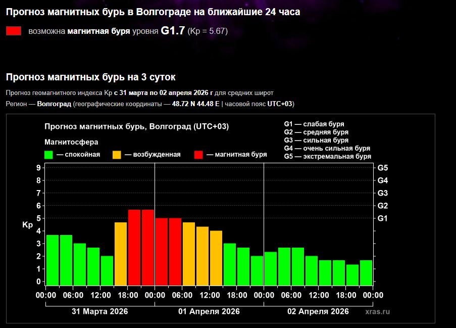 Специалисты Лаборатории солнечной астрономии ИКИ и ИСЗФ спрогнозировали очередную магнитную бурю уровня G1.7 (Kp = 5.67). По расчётам учёных она начнётся вечером 31 марта. Как стало известно «Волжской правде», изменения в геомагнитном поле нашей планеты спровоцирует поток плазменного облака.