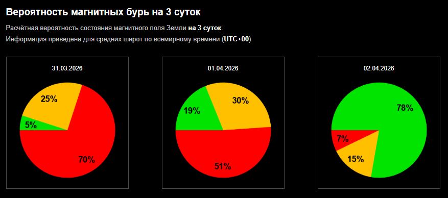 Что касается самой вспышечной активности, то она, безусловно, находится на стадии роста. Заметно, что интервал между двумя выбросами массы 28 и 30 марта составил всего двое суток. Если принять это за характерный цикл накопления энергии, то можно ожидать новый мощный взрыв уже завтра. Математические модели на такой короткий срок ненадёжны, однако сегодня они предсказывают около 20% вероятности новой вспышки X-класса.