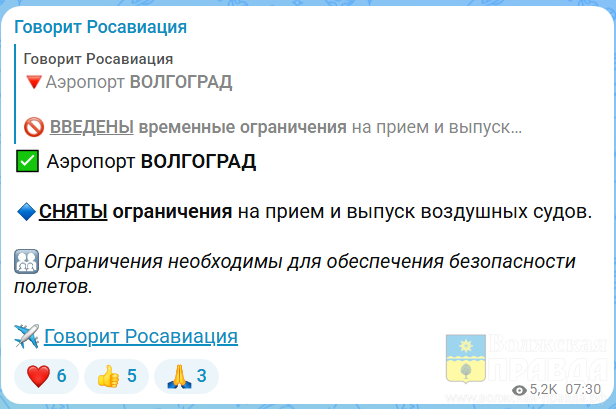 Волгоградский аэропорт ввёл ограничения минувшим вечером в 23:23 часа, а снял лишь в 07:30 нынешнего утра. Об этом сообщил канал Макс «Говорит Росавиация».