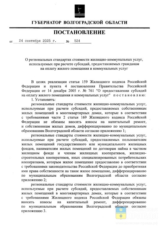 Утверждены новые стандарты стоимости жилищно-коммунальных услуг, необходимые для расчета субсидий, предоставляемых гражданам на оплату жилья и услуг ЖКХ. Об этом гласит соответствующее Постановление губернатора Волгоградской области от 24.09.2025 № 524.