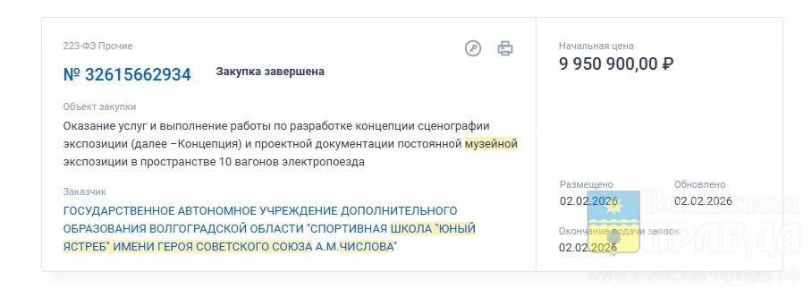 Объектом закупки у единственного поставщика стало оказание услуг и выполнение работ по разработке концепции экспозиции и проектной документации для постоянной музейной экспозиции в пространстве 10 вагонов электропоезда.