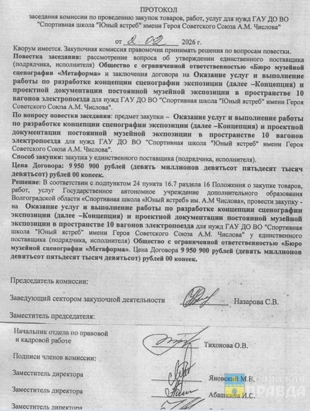 Согласно Протоколу заседания комиссии по проведению закупок товаров единственным поставщиком услуг выступила Санкт-Петербургская компания «Бюро музейной сценографии «Метаформа».