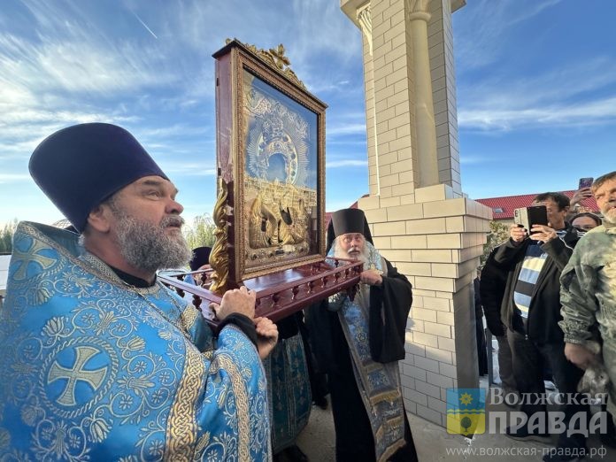 Почти ровно в 16 часов сюда подъехал микроавтобус, из которого и вынесли Феодоровскую икону Божией Матери. Массивная, в золочёном обрамлении и на деревянной подставке, она была не лёгкой. На свои плечи её поставили владыка и благочинный Волжского округа, ещё три священника шли сзади, поддерживая святыню.