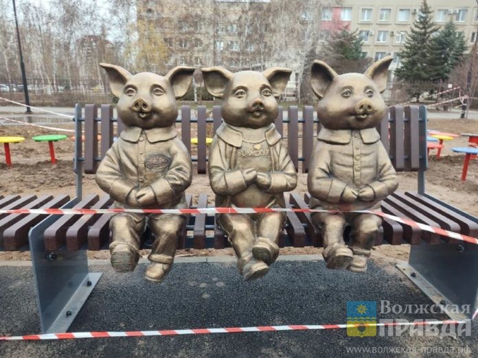 Для самых маленьких жителей Волжского открыта детская площадка, а пешеходную зону рядом с детской поликлиникой украсил арт-объект «Три поросенка». На новом общественном пространстве на улице Мира посадили 120 саженцев каштана, дуба, клена, рябины, сумаха и форзиции.
