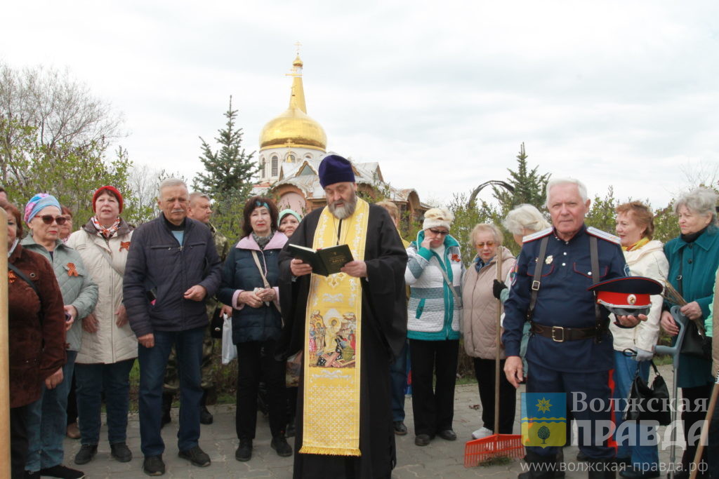 Субботник начался с молебна, который провёл протоиерей, настоятель храма Серафима Саровского Пётр Симора. Под Пасхальный звон колоколов казаки и ветераны вооружились граблями и мешками приступили к уборке прошлогодней травы и сломанных сильными ветрами веток.