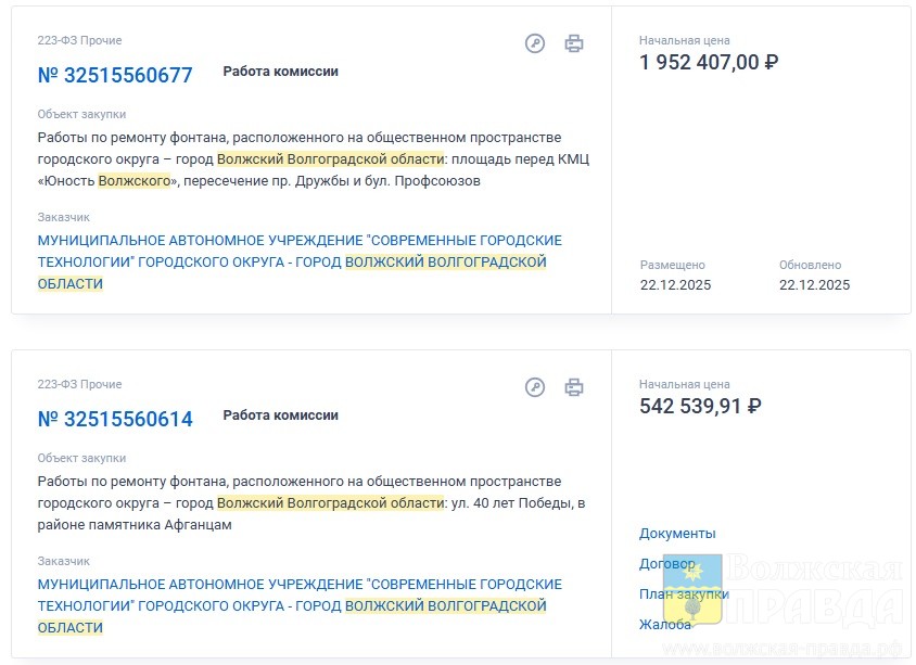 Заказчиком выступает МАУ «СГТ». Начальная стартовая цена муниципального контракта в первой закупке — 1 952 407 рублей, во второй — 542 539,91 рублей.