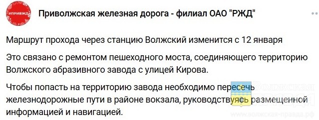 12 января в Волжском стартовал ремонт пешеходного моста, соединяющего улицу Кирова и Волжский абразивный завод. Об этом на своих ресурсах оповестила пассажиров Приволжская железная дорога — филиал ОАО «РЖД».